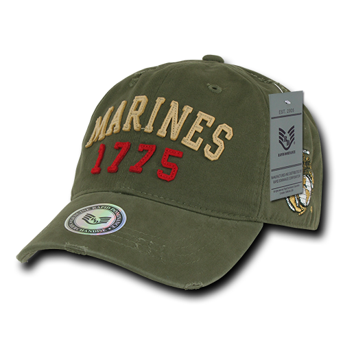 Our Vintage Athletic #Military #cap has a unique washed and destroyed style to it. Applique vintage felt letters and numbers are sewn on the front of the cap and an antique military buckle for the strap closure. We carry all Branches #Marine Corps, Navy, Coast Guard, Army and Air force